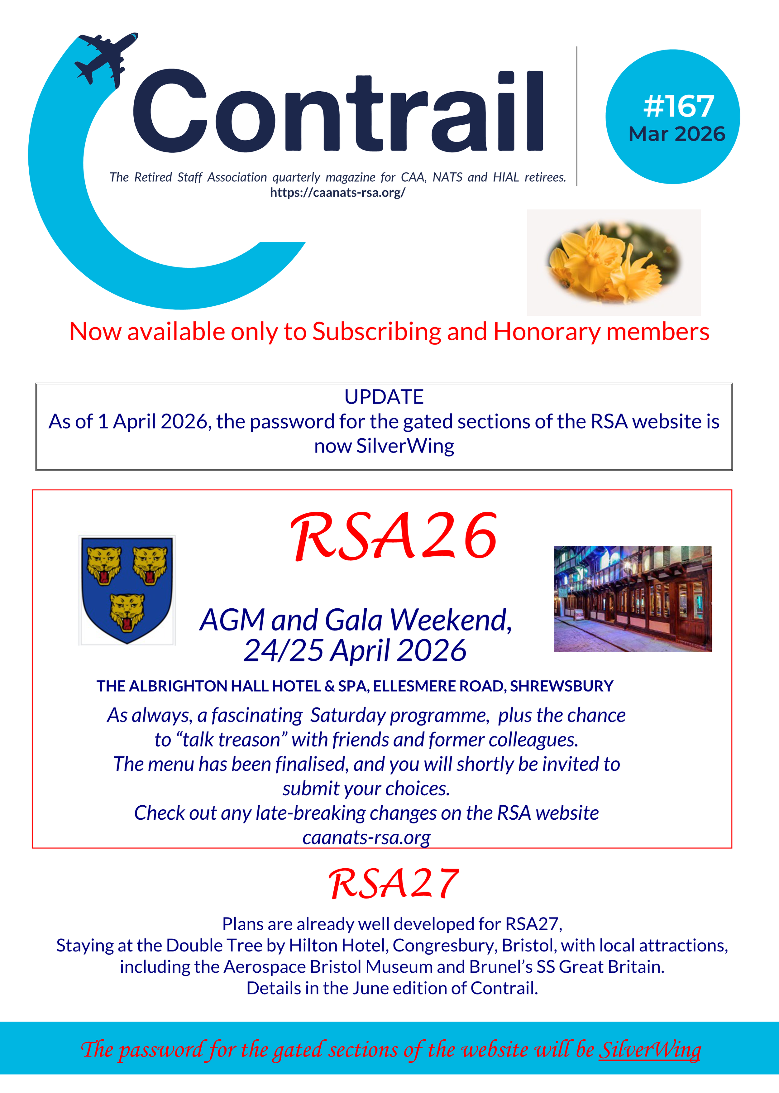 In addition to the routine Branch News and Activities, and Obituaries, this edition includes the RSA26 AGM calling notice, plus updates on those membership changes mentioned above, the latest on the planned move to a digital Contrail in June, and a further update on the CAA Pension Scheme.